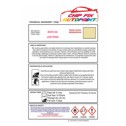 Our BS381C-384 Light Straw Window door paint is the perfect choice for your upvc and pvc plastic windows and doors. Its acrylic-based formulation ensures exceptional adhesion and a vibrant Light Straw finish. An exquisite paint for an exquisite home, our superior quality paint will add a tasteful hint ofclass and sophistication into your home.