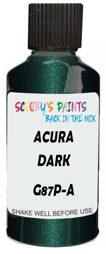 Professionally mixed touch-up paint matched to Acura factory colour G87P-A – Dark Emerald Pearl for model years 1998–2002. Ideal for repairing stone chips, light scratches and minor blemishes while helping to prevent corrosion.