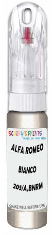 Professionally mixed touch-up paint matched to Alfa Romeo factory colour 205/A,BNRM – Bianco Argento Metallic for model years 1994–1998. Ideal for repairing stone chips, light scratches and minor blemishes while helping to prevent corrosion.