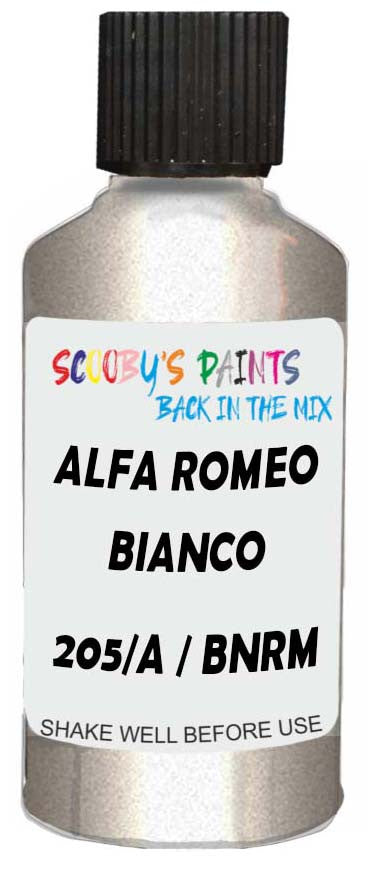 Professionally mixed touch-up paint matched to Alfa Romeo factory colour 205/A / BNRM – Bianco Argento Metallic for model years 1994–1998. Ideal for repairing stone chips, light scratches and minor blemishes while helping to prevent corrosion.