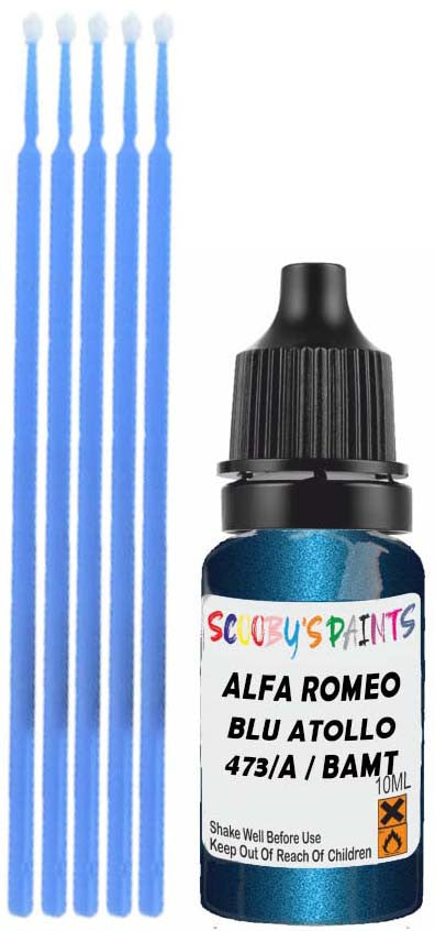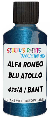 Professionally mixed touch-up paint matched to Alfa Romeo factory colour 473/A / BAMT – Blu Atollo Mica Metallic for model years 1995–2001. Ideal for repairing stone chips, light scratches and minor blemishes while helping to prevent corrosion.