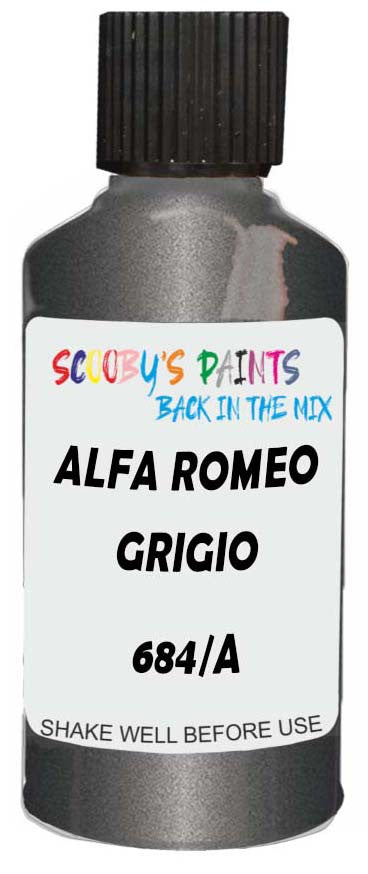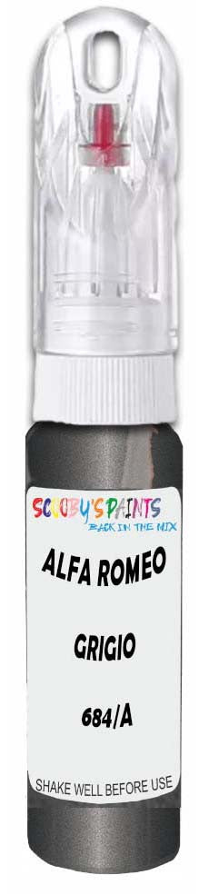 Professionally mixed touch-up paint matched to Alfa Romeo factory colour 684/A – Grigio Dolceacqua Metallic for model years 2004–2007. Ideal for repairing stone chips, light scratches and minor blemishes while helping to prevent corrosion.