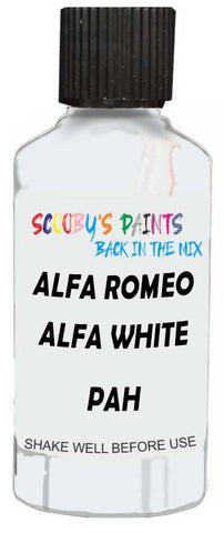 Professionally mixed touch-up paint matched to Alfa Romeo factory colour PAH – Alfa White for model years 2016–2023. Ideal for repairing stone chips, light scratches and minor blemishes while helping to prevent corrosion.