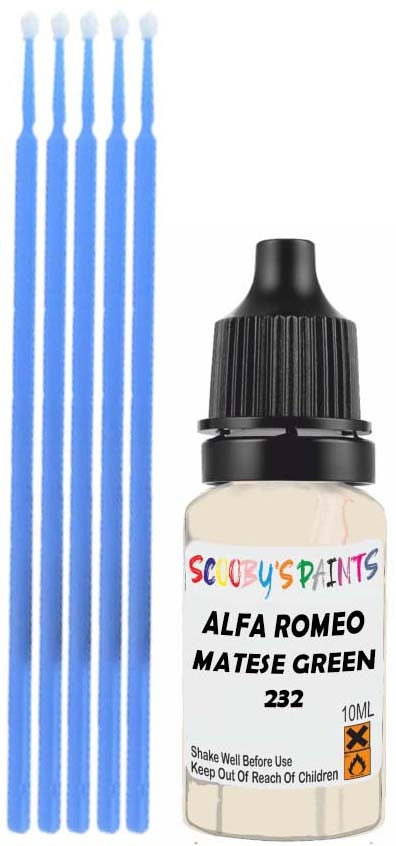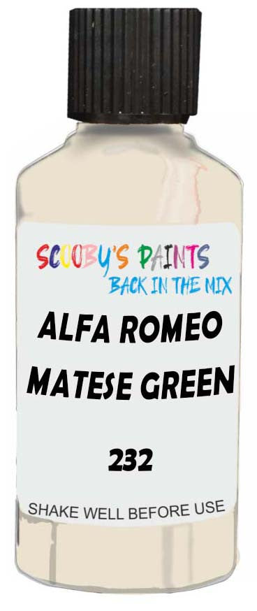 Professionally mixed touch-up paint matched to Alfa Romeo factory colour 232 – Matese Green for model years 1972–1984. Ideal for repairing stone chips, light scratches and minor blemishes while helping to prevent corrosion.