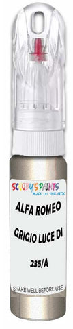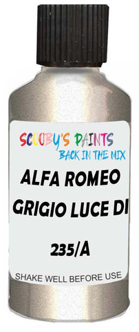 Professionally mixed touch-up paint matched to Alfa Romeo factory colour 235/A – Grigio Luce Di Amalfi Metallic for model years 2004–2007. Ideal for repairing stone chips, light scratches and minor blemishes while helping to prevent corrosion.