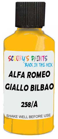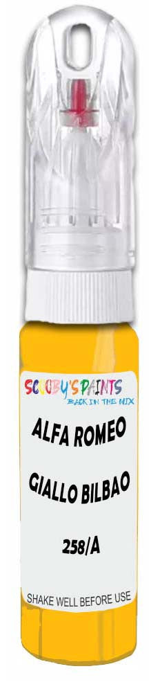 Professionally mixed touch-up paint matched to Alfa Romeo factory colour 258/A – Giallo Bilbao for model years 2001–2004. Ideal for repairing stone chips, light scratches and minor blemishes while helping to prevent corrosion.
