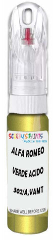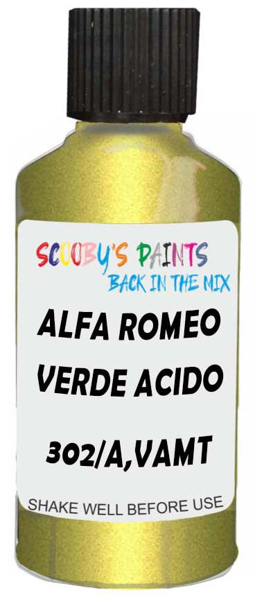 Professionally mixed touch-up paint matched to Alfa Romeo factory colour 302/A,VAMT – Verde Acido Mica Metallic for model years 1995–1998. Ideal for repairing stone chips, light scratches and minor blemishes while helping to prevent corrosion.