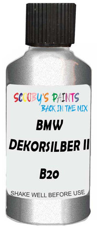 Professionally mixed touch-up paint matched to Bmw factory colour B20 – Dekorsilber Ii Metallic for model years 2012–2022. Ideal for repairing stone chips, light scratches and minor blemishes while helping to prevent corrosion.