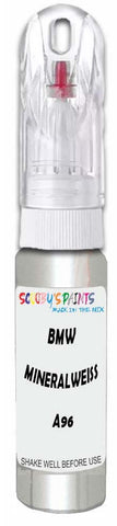 Professionally mixed touch-up paint matched to Bmw factory colour A96 – Mineralweiss Perleffekt for model years 2009–2016. Ideal for repairing stone chips, light scratches and minor blemishes while helping to prevent corrosion.