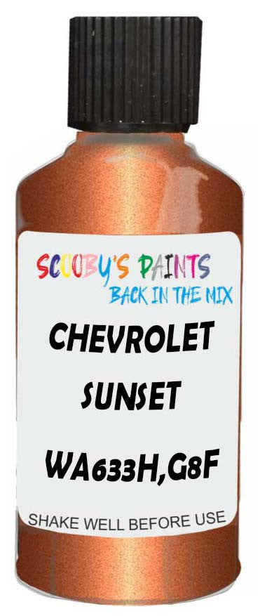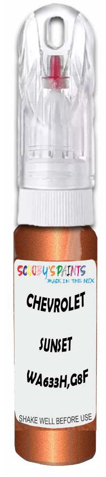 Professionally mixed touch-up paint matched to Chevrolet factory colour Wa633H,G8F – Sunset Orange Metallic for model years 2001–2014. Ideal for repairing stone chips, light scratches and minor blemishes while helping to prevent corrosion.