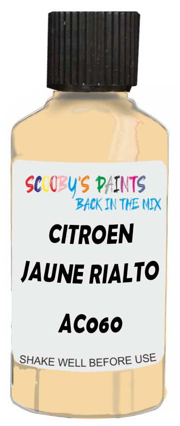 Professionally mixed touch-up paint matched to Citroen factory colour Ac060 – Jaune Rialto for model years 1982–1990. Ideal for repairing stone chips, light scratches and minor blemishes while helping to prevent corrosion.