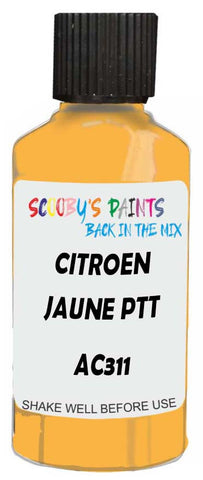 Professionally mixed touch-up paint matched to Citroen factory colour Ac311 – Jaune Ptt for model years 1968–1994. Ideal for repairing stone chips, light scratches and minor blemishes while helping to prevent corrosion.
