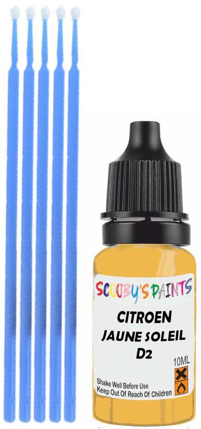 Professionally mixed touch-up paint matched to Citroen factory colour D2 – Jaune Soleil for model years 2010–2013. Ideal for repairing stone chips, light scratches and minor blemishes while helping to prevent corrosion.