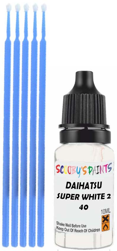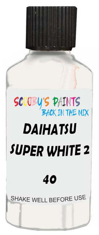 Professionally mixed touch-up paint matched to Daihatsu factory colour 40 – Super White 2 for model years 2004–2017. Ideal for repairing stone chips, light scratches and minor blemishes while helping to prevent corrosion.
