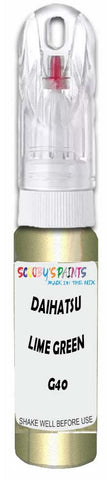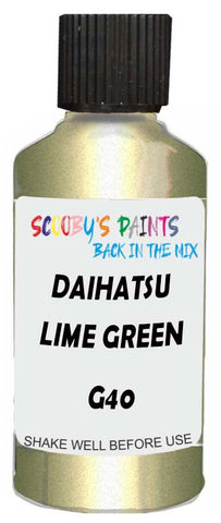 Professionally mixed touch-up paint matched to Daihatsu factory colour G40 – Lime Green Metallic for model years 2004–2008. Ideal for repairing stone chips, light scratches and minor blemishes while helping to prevent corrosion.