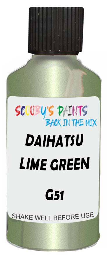 Professionally mixed touch-up paint matched to Daihatsu factory colour G51 – Lime Green Metallic for model years 2010–2017. Ideal for repairing stone chips, light scratches and minor blemishes while helping to prevent corrosion.