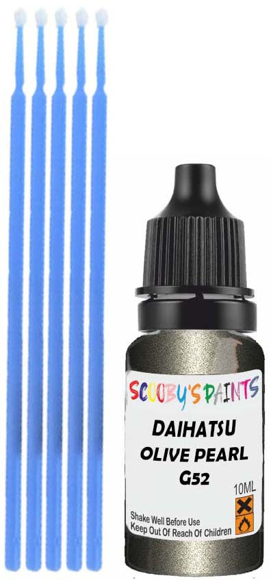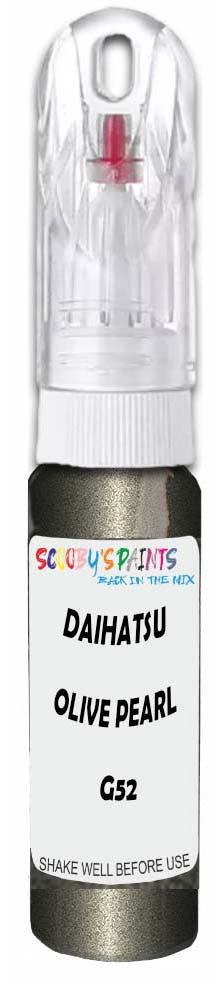 Professionally mixed touch-up paint matched to Daihatsu factory colour G52 – Olive Pearl Metallic for model years 2010–2015. Ideal for repairing stone chips, light scratches and minor blemishes while helping to prevent corrosion.