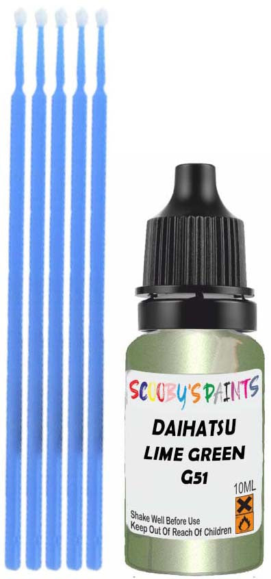 Professionally mixed touch-up paint matched to Daihatsu factory colour G51 – Lime Green Metallic for model years 2010–2017. Ideal for repairing stone chips, light scratches and minor blemishes while helping to prevent corrosion.
