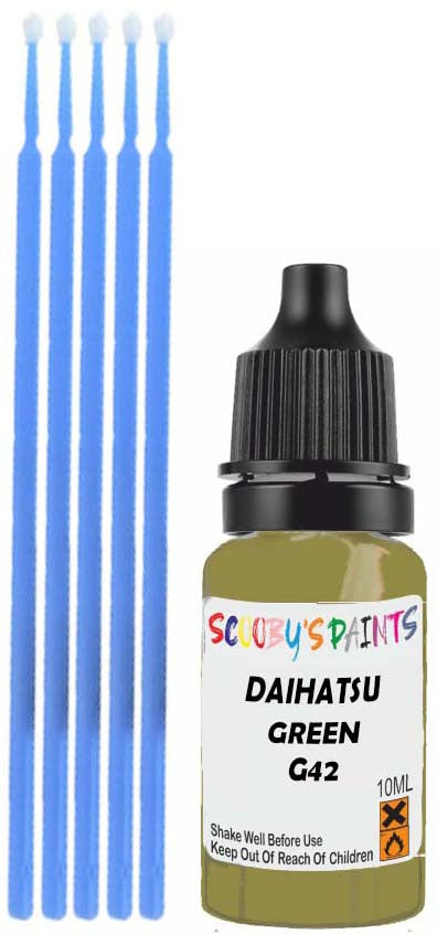 Professionally mixed touch-up paint matched to Daihatsu factory colour G42 – Green for model years 2005–2010. Ideal for repairing stone chips, light scratches and minor blemishes while helping to prevent corrosion.
