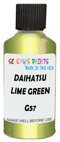 Professionally mixed touch-up paint matched to Daihatsu factory colour G57 – Lime Green Metallic for model years 2015–2018. Ideal for repairing stone chips, light scratches and minor blemishes while helping to prevent corrosion.