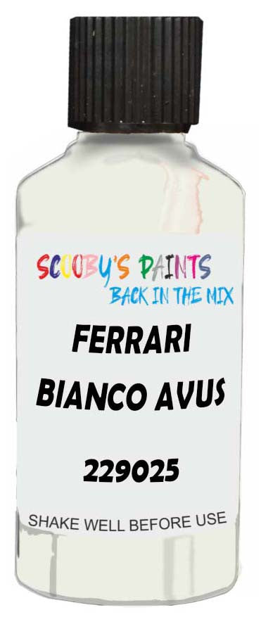 Professionally mixed touch-up paint matched to Ferrari factory colour 229025 – Bianco Avus for model years 2004–2023. Ideal for repairing stone chips, light scratches and minor blemishes while helping to prevent corrosion.