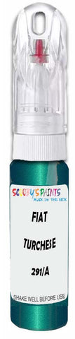 Professionally mixed touch-up paint matched to Fiat factory colour 291/A – Turchese Colpo Di Fulmine Metallic for model years 2005–2007. Ideal for repairing stone chips, light scratches and minor blemishes while helping to prevent corrosion.