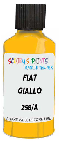 Professionally mixed touch-up paint matched to Fiat factory colour 258/A – Giallo Ginestra for model years 1994–2017. Ideal for repairing stone chips, light scratches and minor blemishes while helping to prevent corrosion.