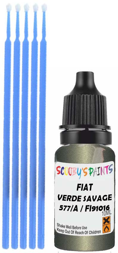 Professionally mixed touch-up paint matched to Fiat factory colour 577/A / Fi91016 – Verde Savage Metallic for model years 2007–2015. Ideal for repairing stone chips, light scratches and minor blemishes while helping to prevent corrosion.